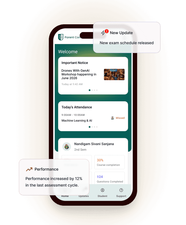 Get real-time visibility into your child's attendance, learning progress, and collaborating university/college updates all in one place.