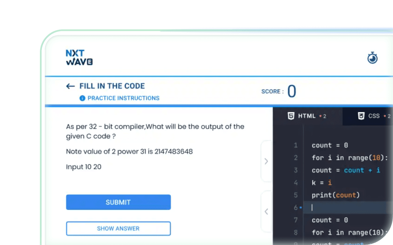 Test your skills across 125+ question types including MCQs, coding, audio, and AI-evaluated formats.